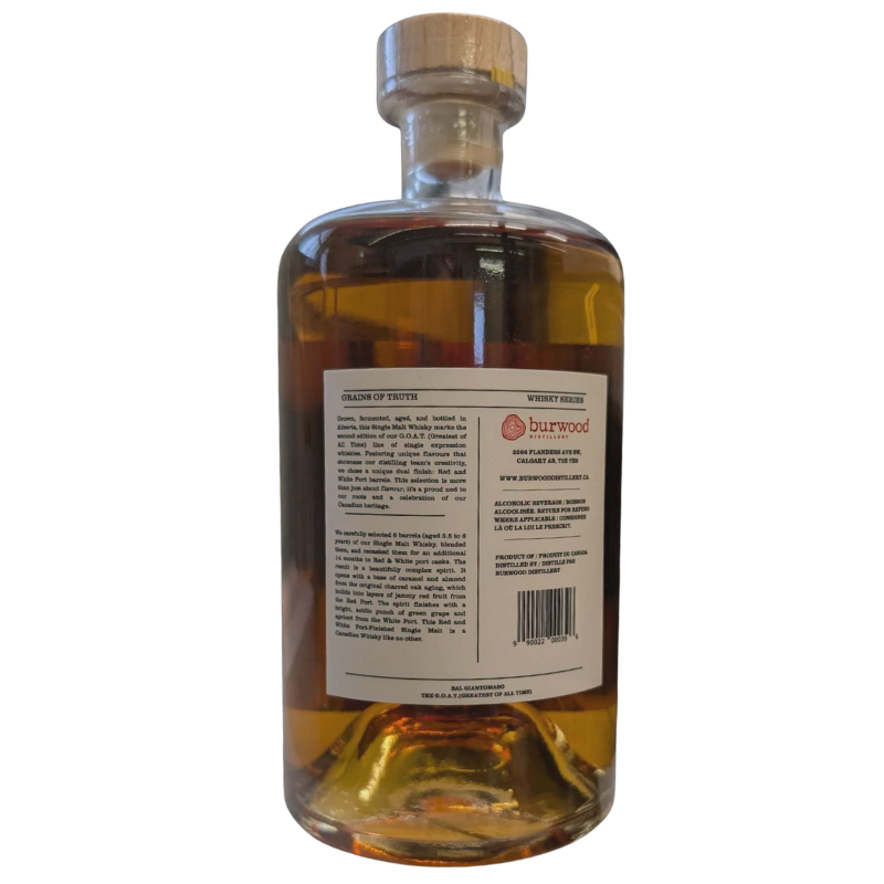 Grown, fermented, aged, and bottled in Alberta, this Single Malt Whisky marks the second edition of our G.O.A.T. (Greatest of All Time) line of single expression whiskies. Featuring unique flavours that showcase our distilling team's creativity, we chose a unique dual finish: Red and White Port barrels. This selection is more than just about flavour; it's a proud nod to our roots and a celebration of our Canadian heritage.